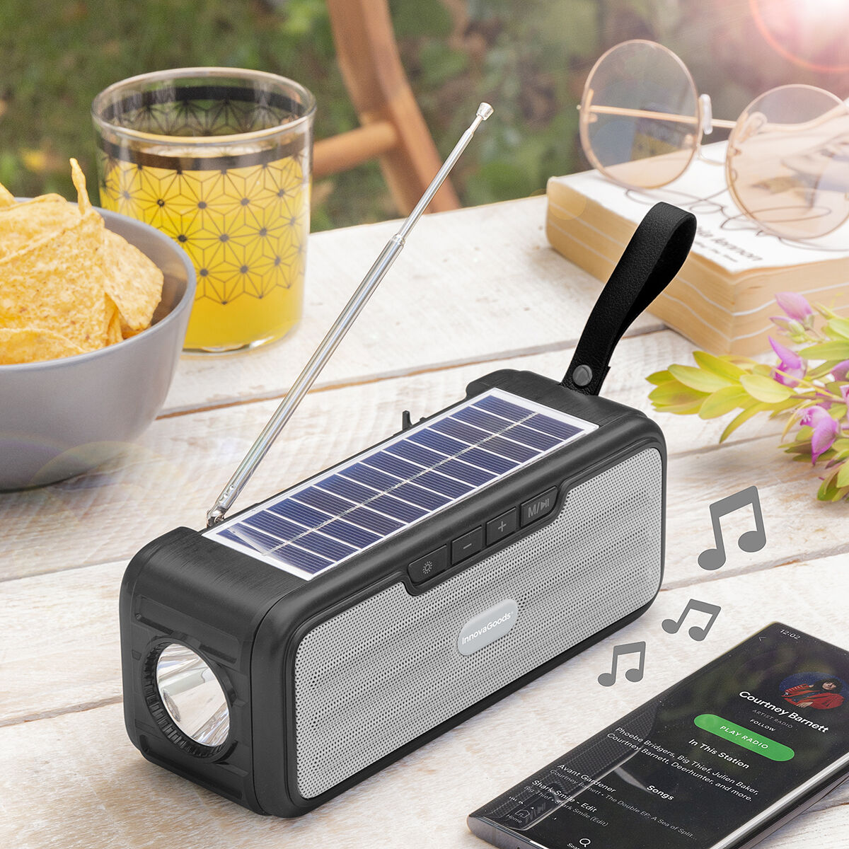 A rechargeable wireless speaker with an extremely versatile and multifunctional modern design which can also be used as a torch and a radio. It can be charged with a USB or by solar charging (integrated solar panel), placing it in the sunlight during the day (eco-friendly). This original, lightweight and portable speaker can easily be transported and used anywhere, making it ideal for outdoor use (pool, garden, camping, etc.). The LED light allows you to choose from 3 intensity levels. It has Bluetooth 5.0, an aerial, FM radio and hands-free function for taking calls (built-in microphone). It also has a cord for hanging it up and for transporting it more conveniently. Its USB input and the input for the microSD card (not included) allow you to play music in MP3 format. It also has a 3.5 mm auxiliary jack input for other sound sources. Includes a USB to micro USB cable.