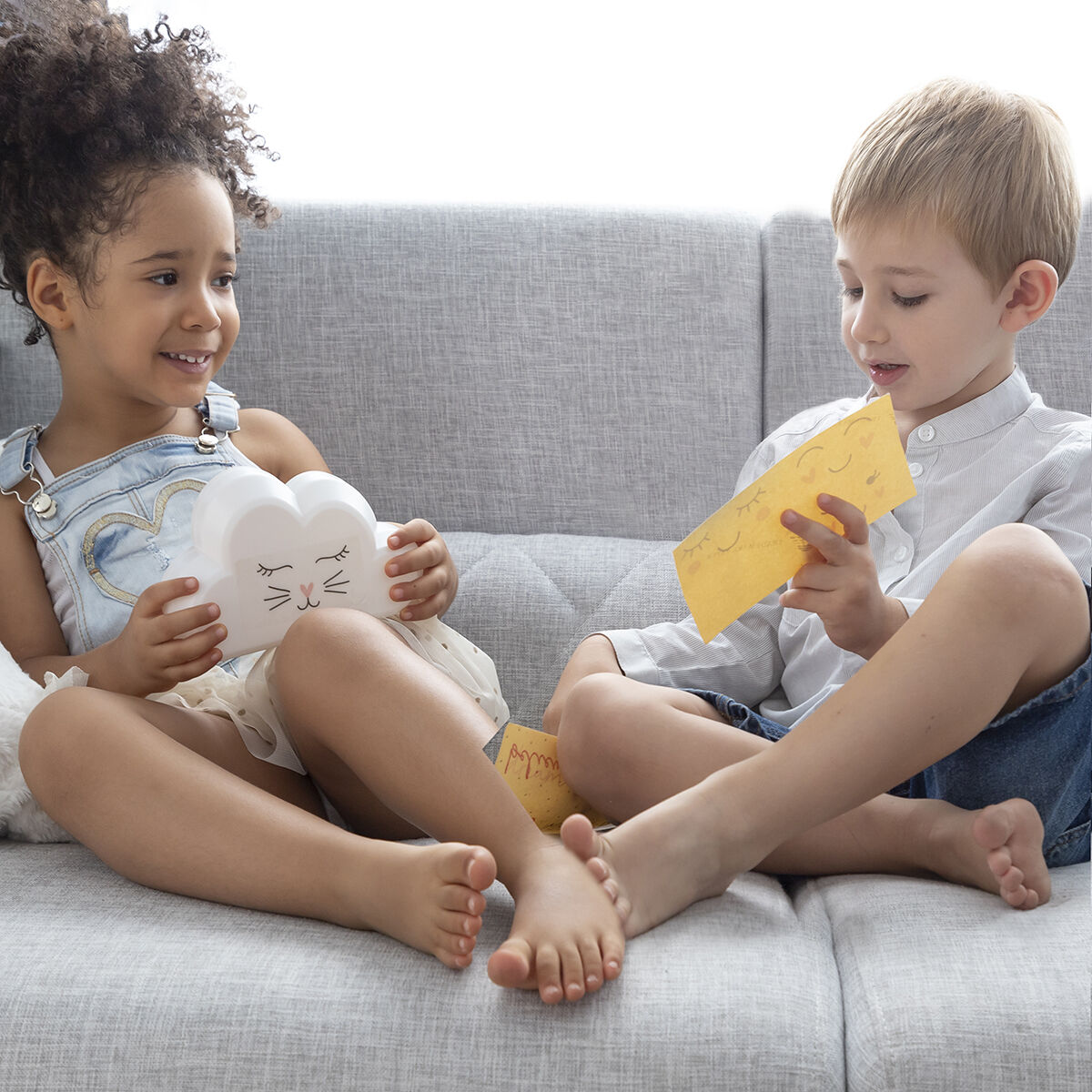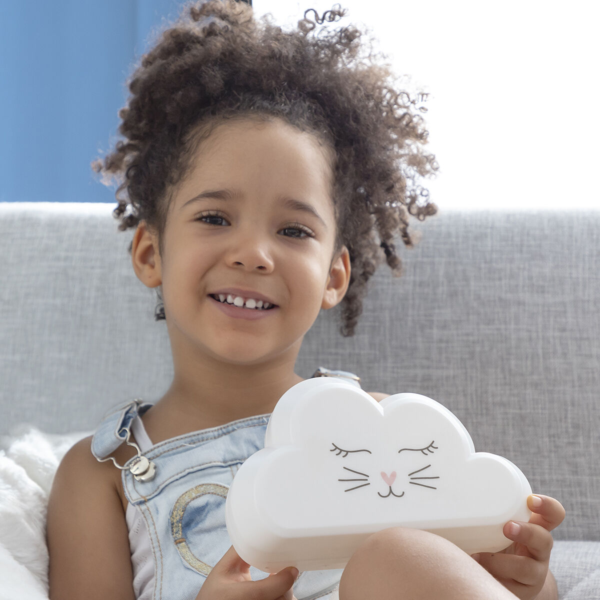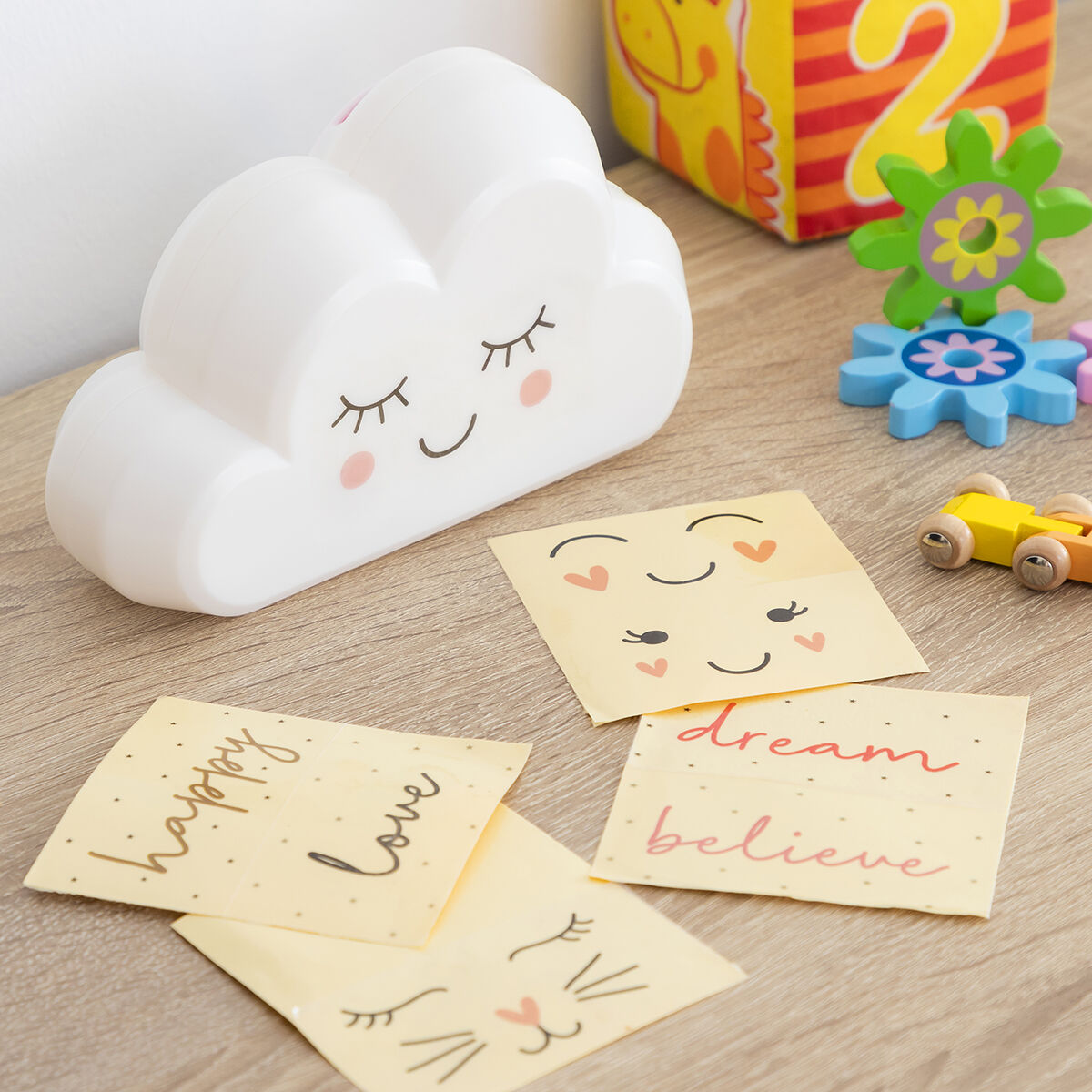 An original lamp with rainbow projector and stickers, ideal for decorating and lighting in children’s rooms. This original multifunction LED lamp is perfect for use as a nightlight and helps children to relax and fall asleep. It also includes 8 reusable decorative stickers so the little ones can have fun each night personalising their lamp. It works using 3 x AAA batteries (not included) and is very easy to use since it has a single on/off button for switching it on and off. The lamp is shaped like a cloud, it has a white light and projects a rainbow onto the wall from the back. In order to enjoy the rainbow effect, the room should be dark and the lamp should be placed very near to the wall (a distance of between 5 and 15 cm approx.). As it is lightweight and portable, it can easily be used anywhere, without cables or plugs, and for greater safety, it will not heat up or cause burns.
